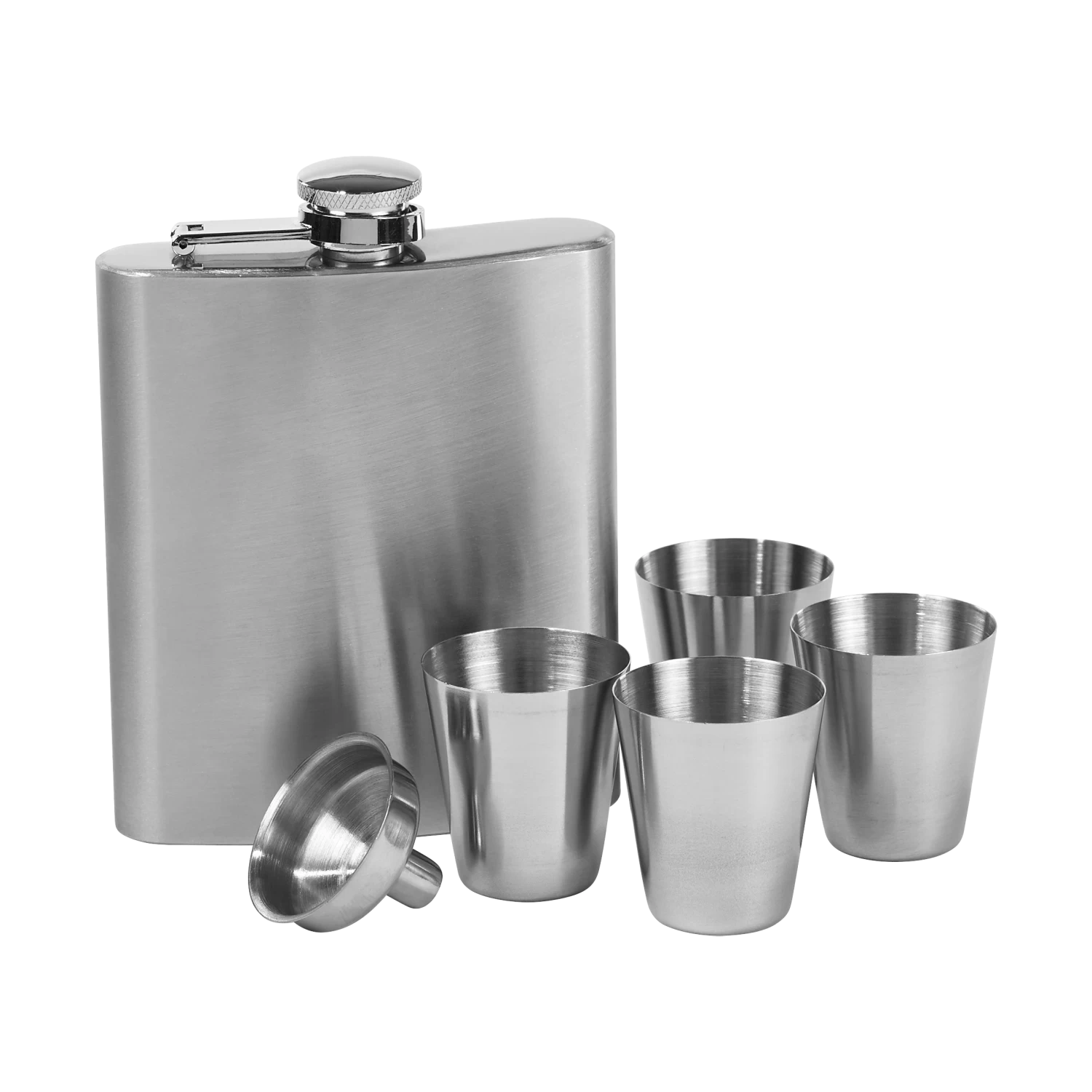 Funktionelles 6-teiliges Flachmann-Set aus 18/10 Edelstahl mit mattem Finish. Der Flachmann passt auf der Jagd oder auf einer Wanderung im Wald perfekt in die Innentasche der Jacke. Das Set enthält einen Flachmann mit 200 ml, 4 Trinkbecher mit 30 ml und einen praktischen Trichter zum Füllen der Flasche.