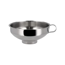 Praktischer Trichter mit Henkel aus Edelstahl. Die obere Öffnung des Trichters hat einen Durchmesser von 15 cm und die untere Öffnung hat einen Durchmesser von 5,3 cm. Die breite Öffnung unten macht den Trichter ideal zum Abfüllen von Marmelade, Gelee oder Püree in Gläser. Für den Geschirrspüler geeignet.