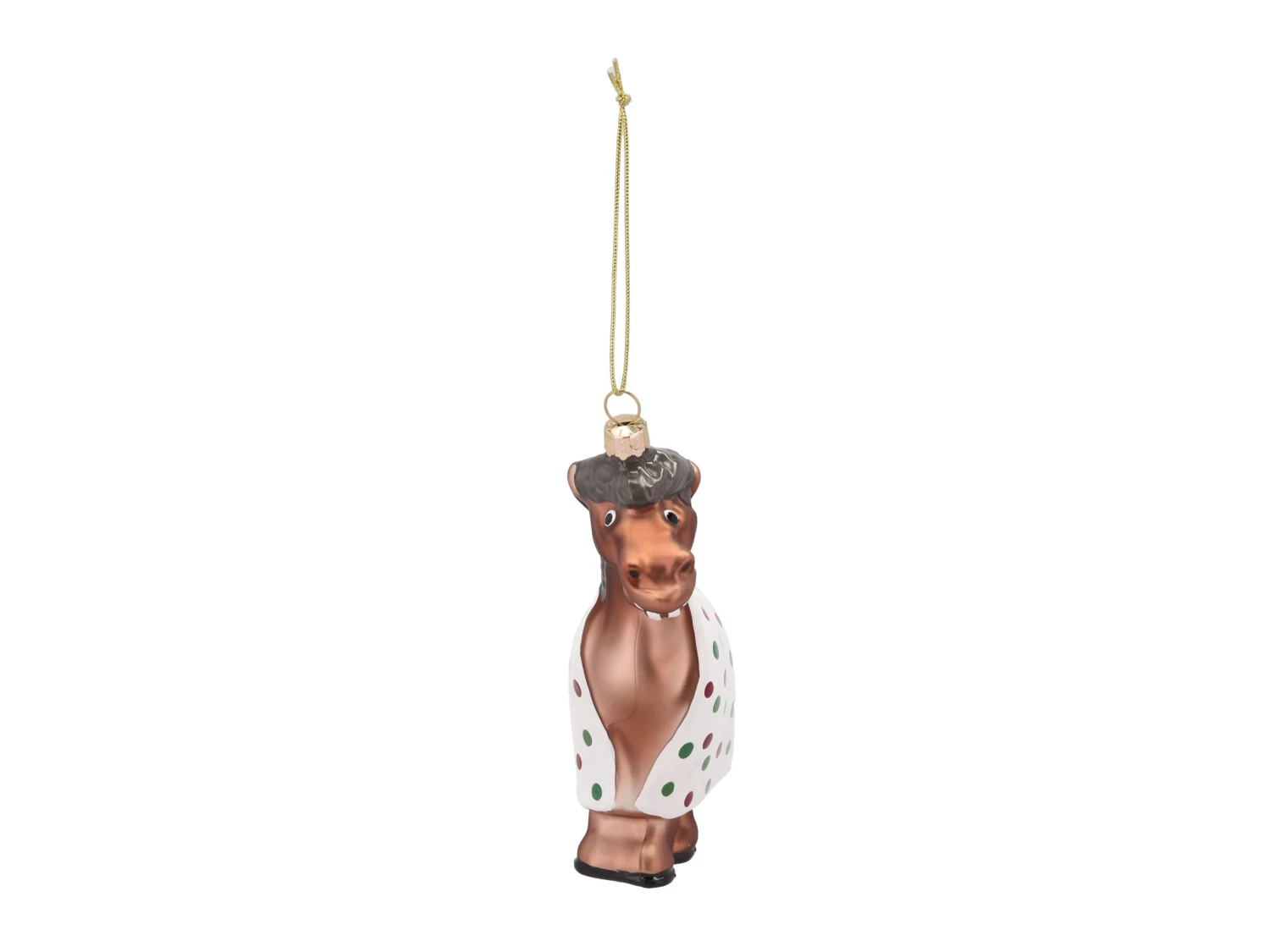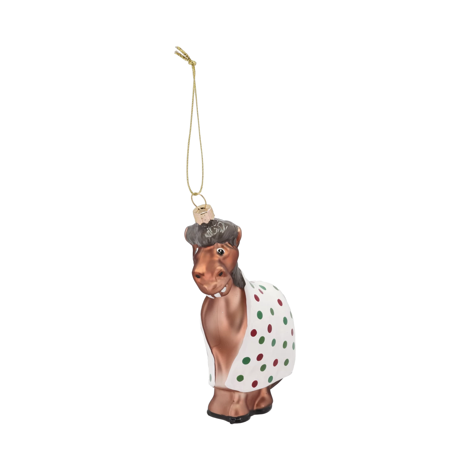 Das Pferd Harry hat seinen Geburtstagszug verlassen und ist in seine feine Weihnachtsdecke mit roten und grünen Punkten gesprungen. In einer glänzenden Glasversion ist er bereit, mit den anderen Weihnachtskugeln am Baum um die Wette zu funkeln.