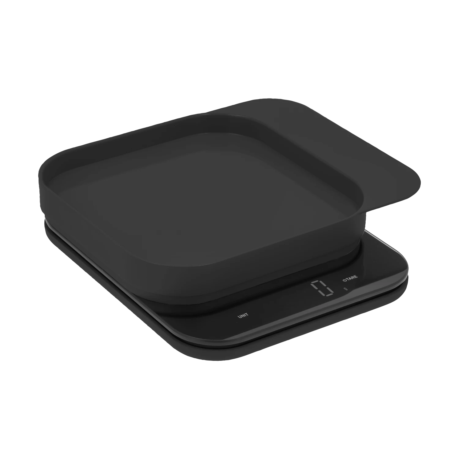 Man kann zwischen mehreren Maßeinheiten wechseln, g, kg, oz, lb, ml, fl oz, und die Waage verfügt über eine Tara-Funktion. Wird manuell eingeschaltet und schaltet sich automatisch ab. An der Unterseite sitzen vier L-förmige Silikonfüße in der gleichen Farbe wie die Waage.
