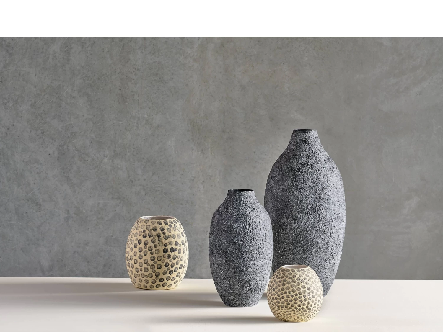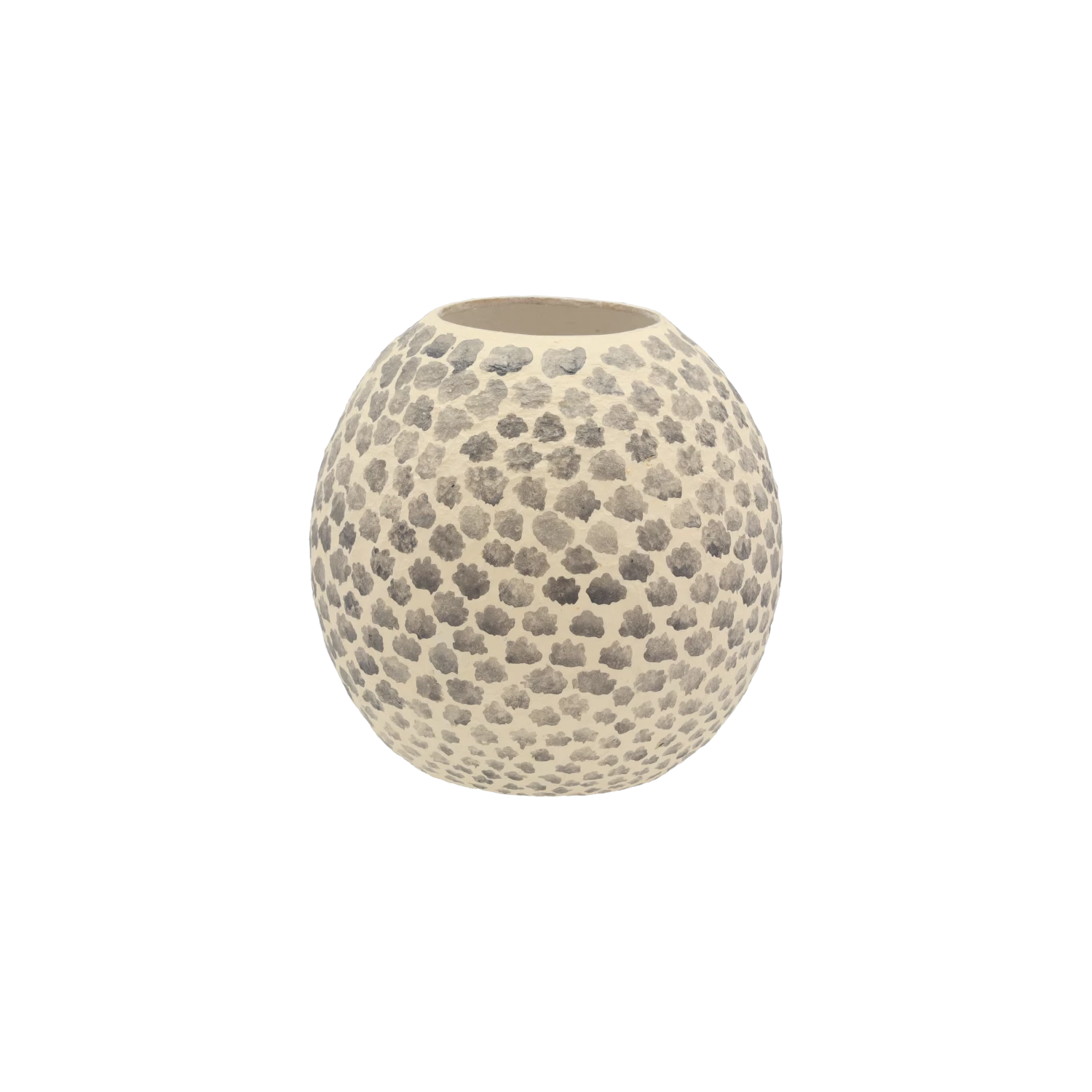 Tolle Dekorationsvase aus cremefarbenem Pappmaché mit dunkelgrauen Punkten, 20 cm hoch. Die hübsche Vase ist mithilfe einer Form hergestellt und von Hand fertiggestellt worden. Die Hintergrundfarbe wird aufgesprüht und die Punkte werden anschließend von Hand gemalt. Anschließend erhält die Vase eine Versiegelung.