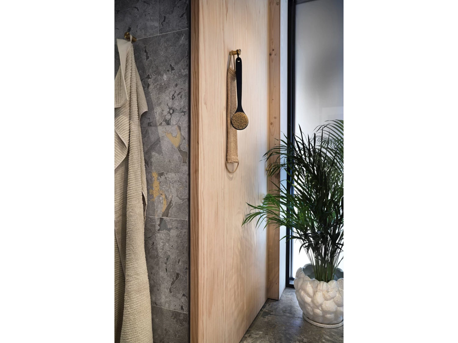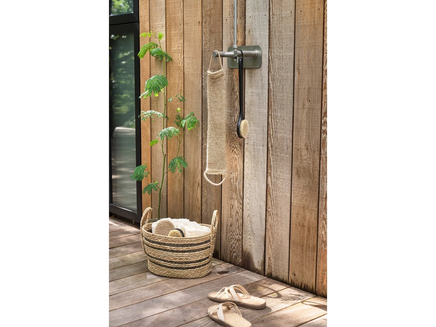 Hübsche Badebürste aus Schima-Holz, einem immergrünen Baum, der mit der Teebaum-Familie verwandt ist, und Borsten aus Naturhaar für ein sanftes Peeling.