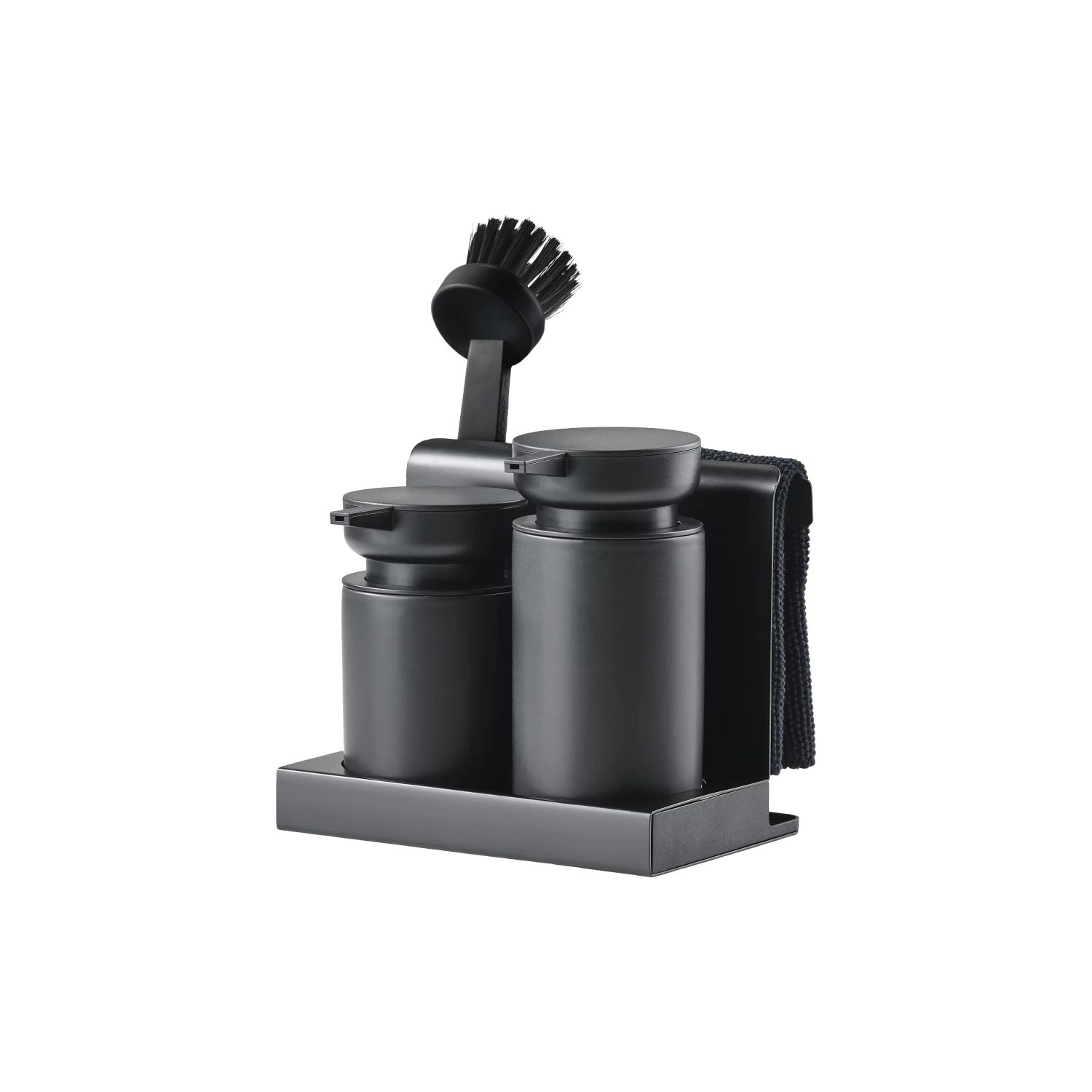 Vorn steht das Spenderduo mit Spülmittel und Handseife/ Desinfektionsmittel. Beide Teile sind aus Keramik. Dahinter hängt ganz unscheinbar das gestrickte Spültuch zum Trocknen, bis es benötigt wird. Gesellschaft erhält es von der Bürste in passender Farbe. Ein letztes praktisches Detail ist die kleine Bodenschale, die überschüssiges Wasser auffängt, damit es nicht auf dem Küchentisch landet.