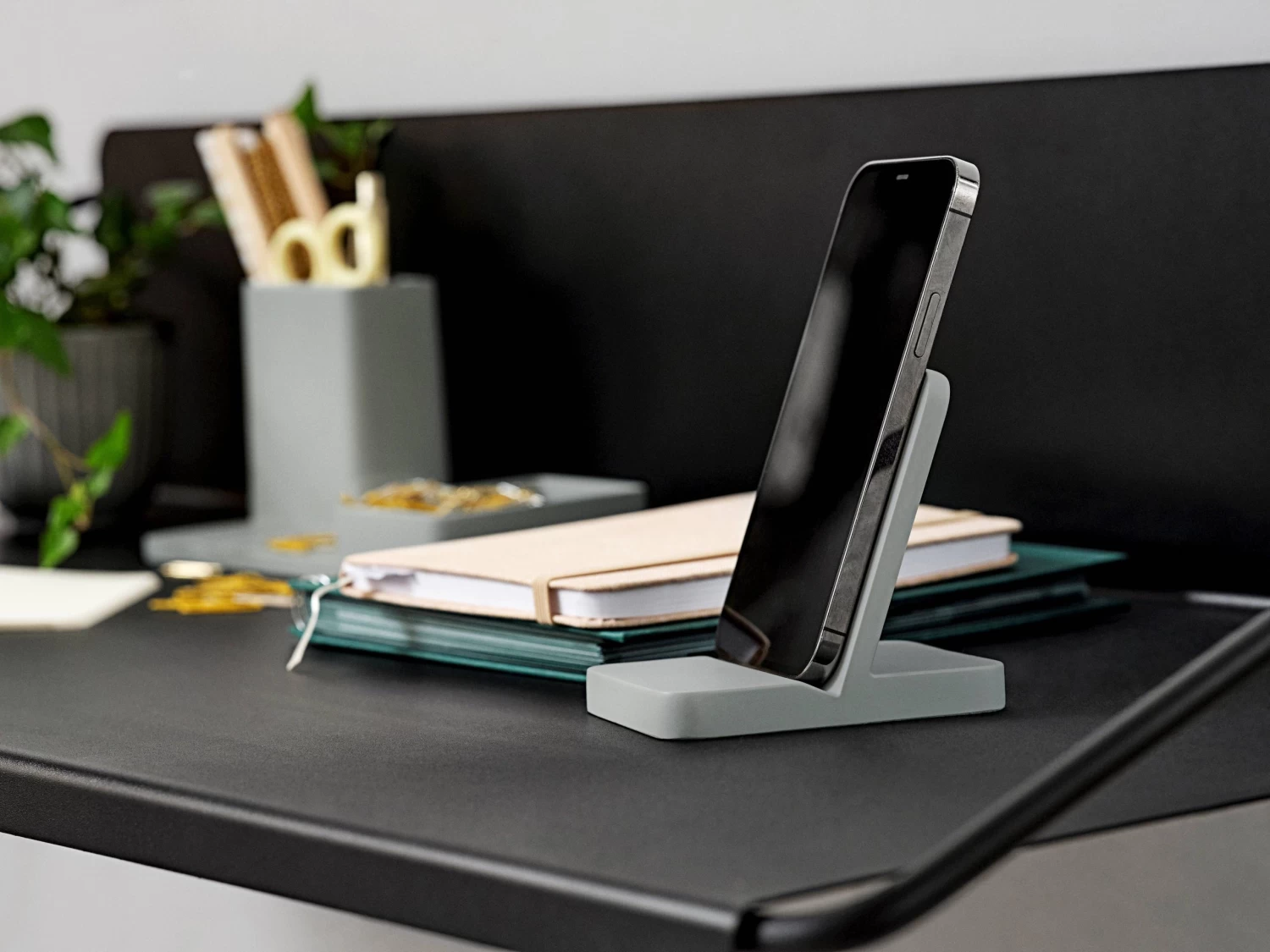 Halten Sie Ordnung auf Ihrem Schreibtisch mit einem schicken Smartphone-Halter, der zum übrigen Schreibtisch-Zubehör der Serie passt. Der Smartphone Halter besteht aus lackiertem Beton, der für einen interessanten Kontrast zum schlichten und leichten Design sorgt, und misst 10 x 7 x 8,9 cm.